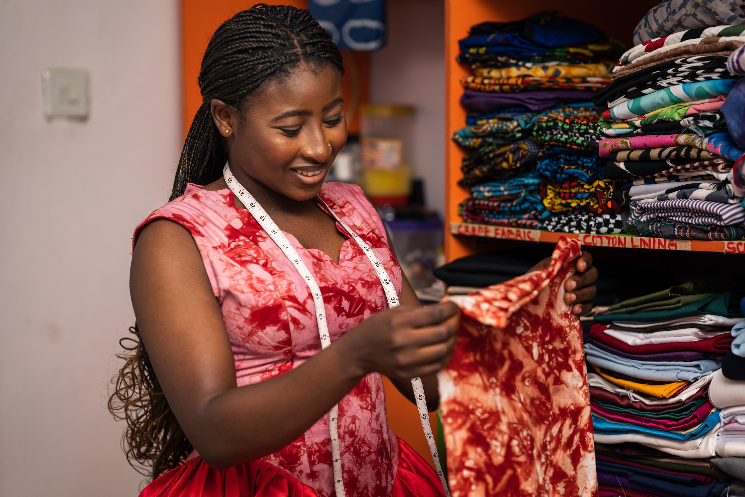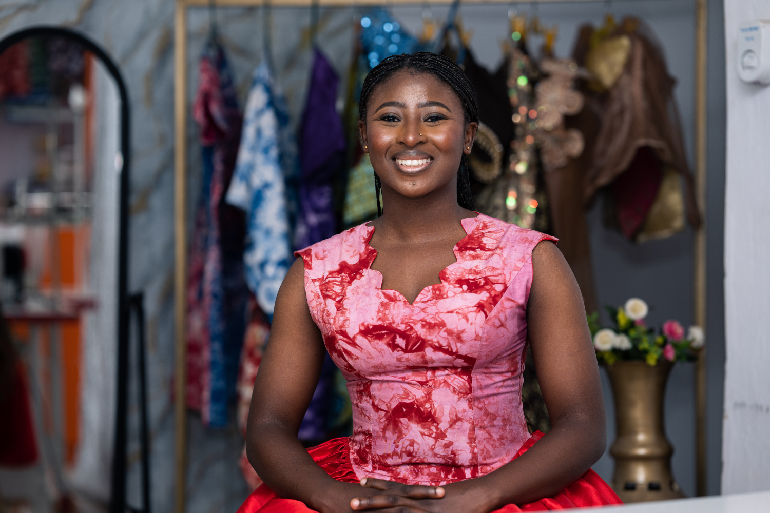 Miracle Olaoluwa is the Creative Director of Miraps Styles, a fashion brand based in Abeokuta, Nigeria. Her business designs bridal wear, bespoke outfits, and Adire pieces, while also training fashion students to build careers of their own. Here, she shares her unexpected journey from food scientist to fashion designer, and how our Road to Growth programme supported her to access funding and grow her empire.